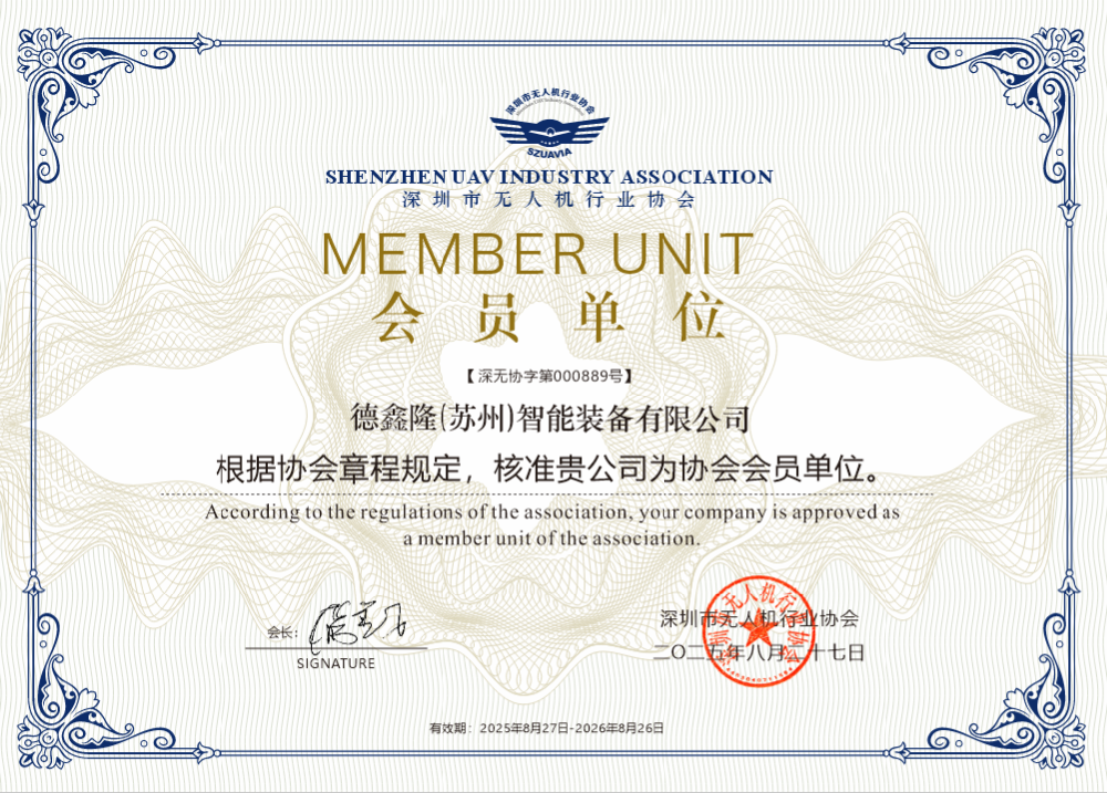 德鑫隆(蘇州)智能裝備有限公司榮任深圳市無人機(jī)行業(yè)協(xié)會(huì)會(huì)員單位